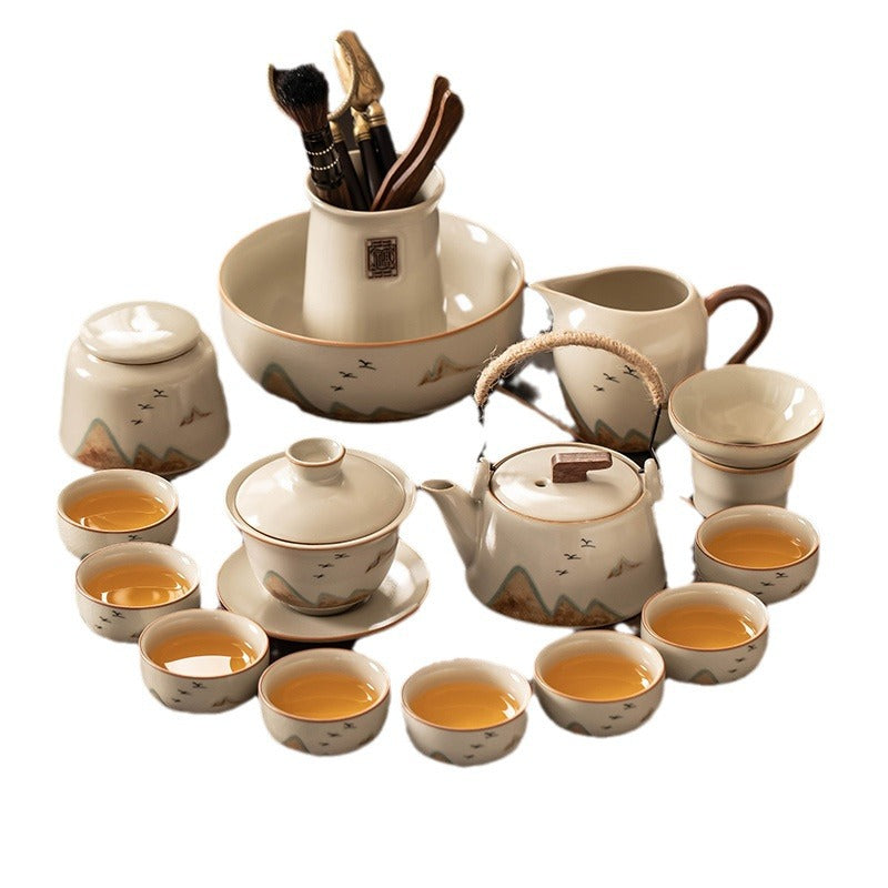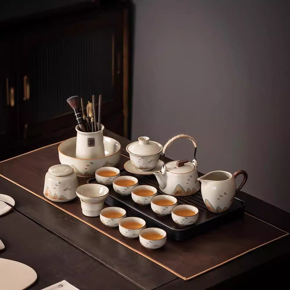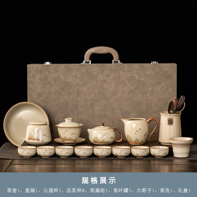 Beige Ruyao Kung Fu Tea Set Set Household Light Luxury Teapot Cover Bowl Tea Office Ceramic Teacup Tea Tray Complete Set